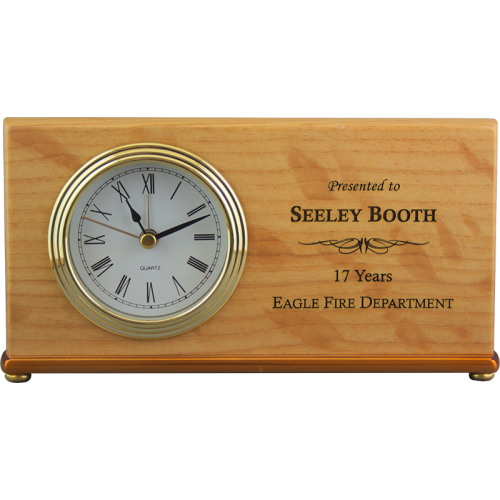 This elegant quartz clock measures 7.5" x 4" and is constructed of Red Alder. It features gold trim and would make a thoughtful gift for anyone. It is powered by one AA battery (included).