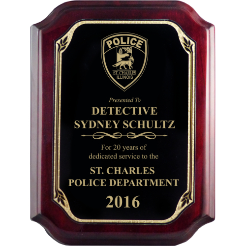 This premium mahogany piano finish scallop edge plaque makes the perfect award to commemorate the service of a dedicated detective or officer. The black brass plate shaped to match the board comes with engraving of your choice.