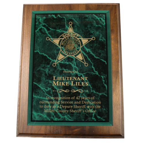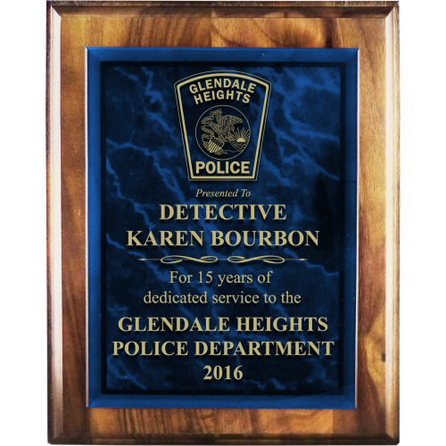 This genuine wood plaque features an acrylic plate with a marbled texture. It's available in several sizes and offers a wide variety of customization. This plaque is shown as "portrait" but can be "landscape" if you choose.