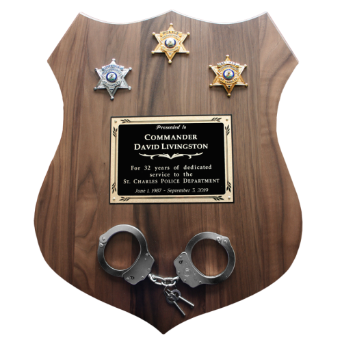 This unique 8" x 10" shield-shaped genuine walnut plaque is perfect to commemorate an officer's time..