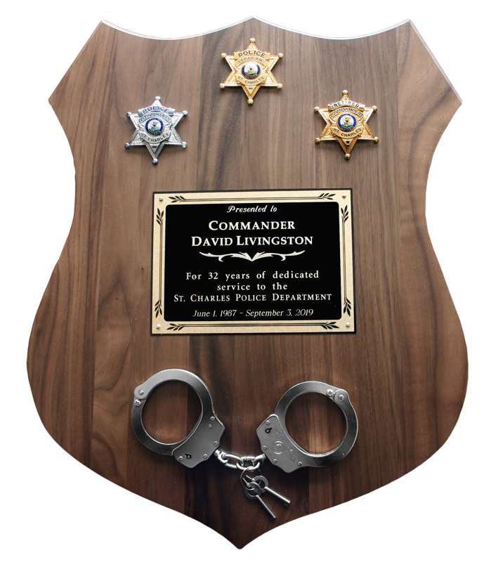 This large plaque is 19" tall by 13 1/2" wide and is perfect for retirements, memorials, recognition, and length of service awards. By choosing this plaque, you are commemorating someone's service and dedication in an honorable and admirable way. The beautiful solid walnut plaque board has round-over edges with a semi-gloss finish and includes shiny silver or black handcuffs. Also included is the mounting charge for two badges and this large plaque may accommodate up to 4 badges. While the badges will be mounted, they aren't included in the price and must first be supplied by the customer or we may order them for an additional charge.