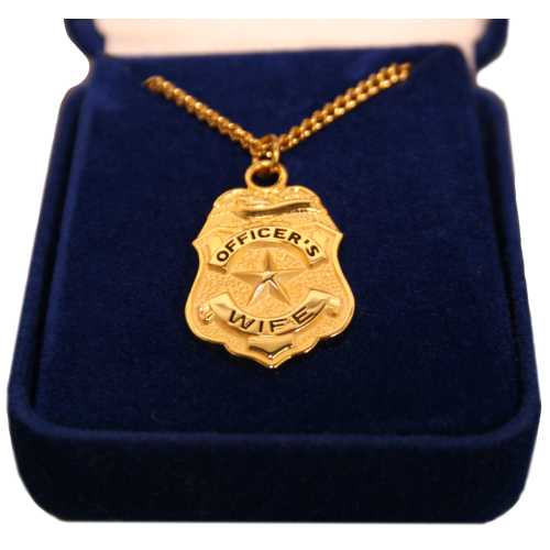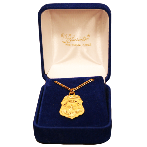 A gold plated badge shaped necklace engraved with the words "Officer's Wife" with a star in the middle.   Comes with a blue velour gift box.