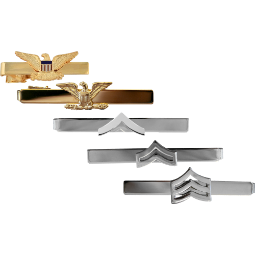 These are American-made Tie Bars. They are available in your choice of either a gold plate or a non-tarnish rhodium plate finish, with Rank Insignia of your choice.