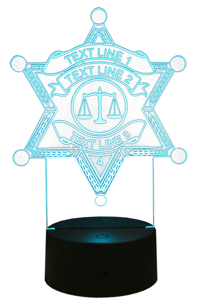 This Light Up Acrylic Sheriff Badge is mounted on a lighted base with an on/off switch and can be powered with USB or 3 AA batteries. This product includes a remote (pictured) with 15 colors, 4 different modes, and on/off buttons. Please insert the text you would like for each badge line in the engraving text box, separate with commas.